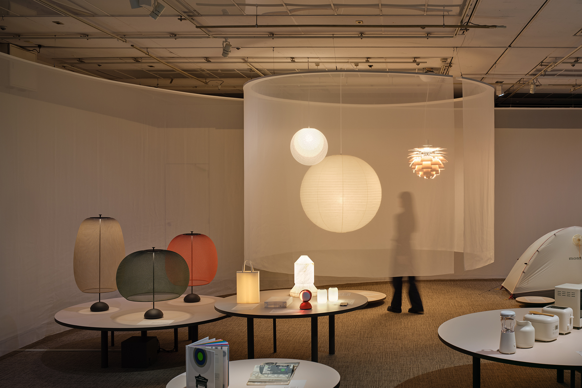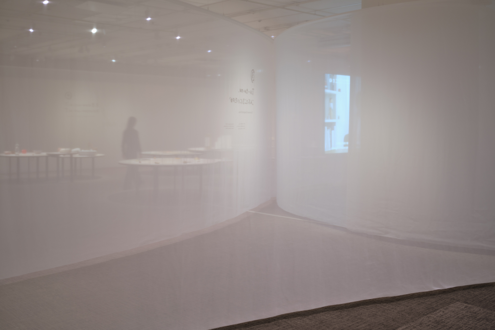 展示空間をやわらかくゾーニングするのは、透過性のある薄い布。