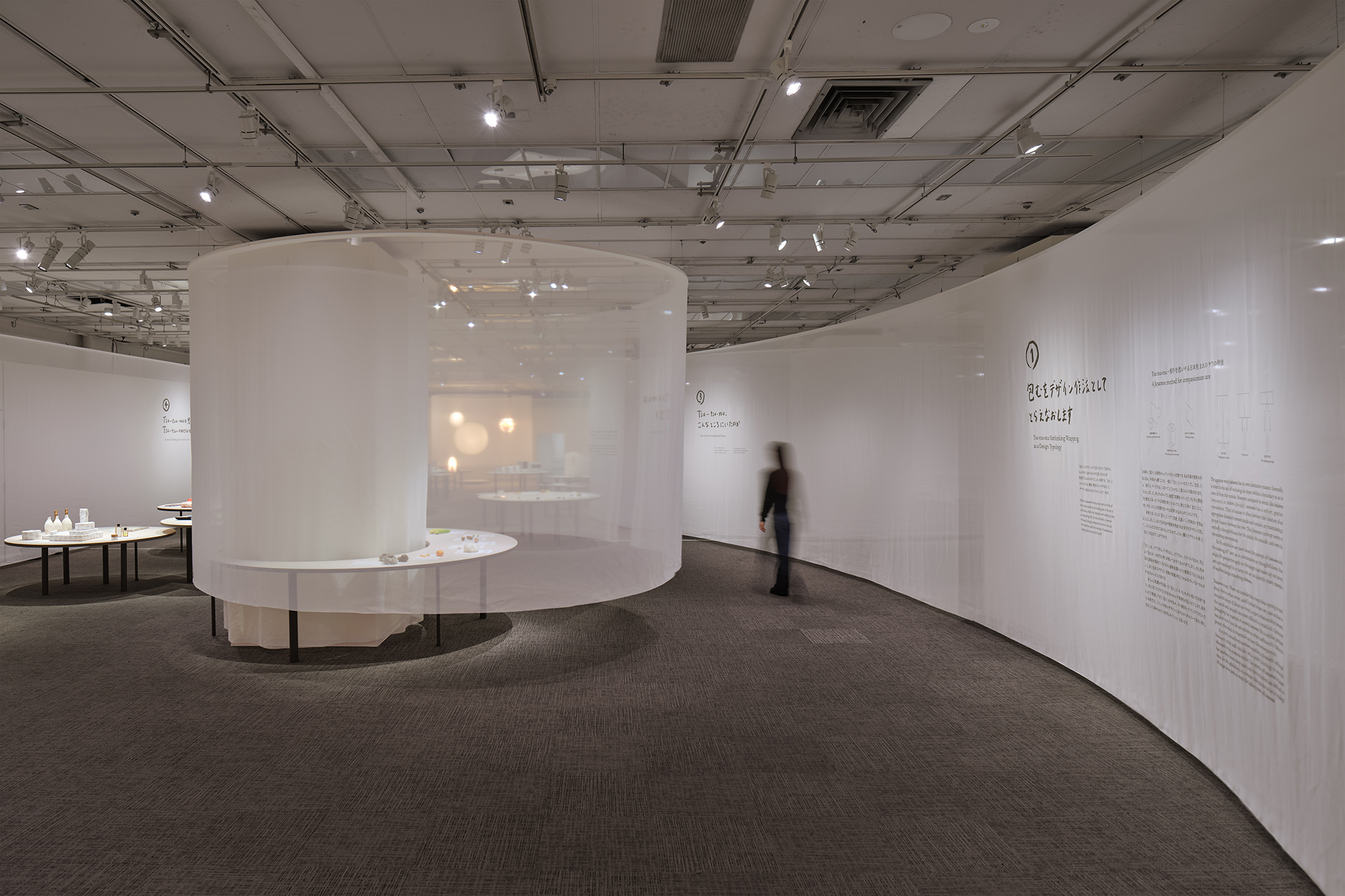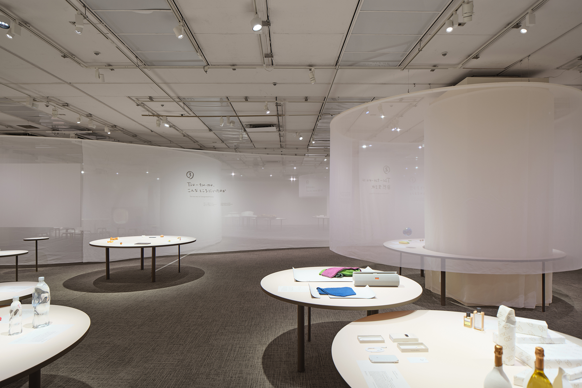 会場では、長さや大きさの異なる"布の円"がさまざまな居心地を作り出しておりTsu-tsu-muというデザイン作法による人と人との関係の調整や、展示物と人との程よい距離感を体感いただけます。